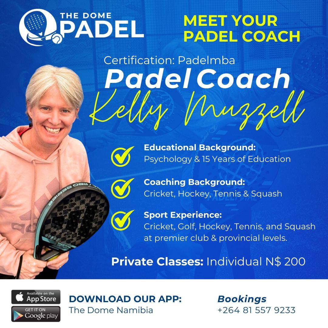 Now, Kelly is bringing her enthusiasm and expertise to Swakopmund, eager to inspire and develop the next generation of padel players. She is excited to help build a vibrant padel community at the MTC Dome.